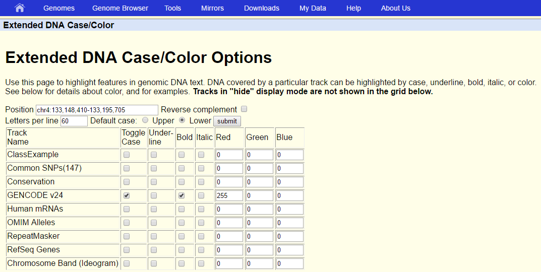 * Click the “extended case/color options” button and configure the display so that known gene exons are in bold, red and upper case letters.
