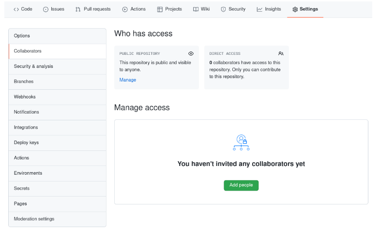 The Owner needs to give the Collaborator access. On GitHub, click the “Settings” button on the right, select “Collaborators”, click “Add people”, and then enter your partner’s username.